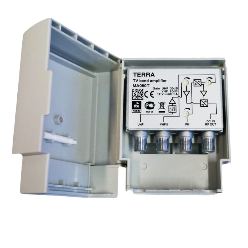 LTE700-Ready. Vahvistus (FM 8-20dB, VHF III 8-20dB, UHF 15-30dB (470-694MHz)). Estovaimennus 703MHz -10dB UHF-alueen vahvistuksesta. Lähtötaso IMD3=60dB 105dBuV. Käyttöjännite +12V / 60 mA.