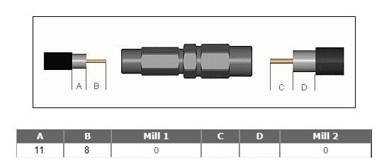 50ohm N-urosliitin Ören Kablo WLC 400 HFFR kaapelille, HardLine. Kaapelille tehdään kaksi kuorintaa. Kuorintamitat kaapeliin NM/50-201/50 AG/AG liittimelle on seuraavat. Keskilankaa kuoritaan näkyviin 8 mm ja ulkovaippaa kuoritaan pois tämän lisäksi 11 mm.