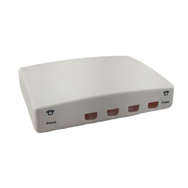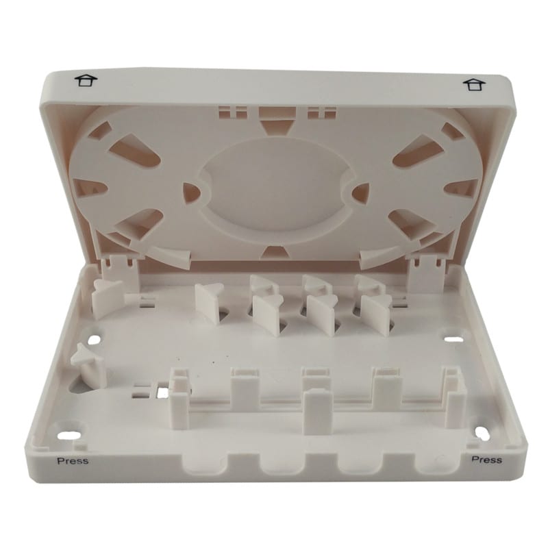 Kuitupäätekotelo, 4 kpl SC- SX tai LC-DX adapteripaikkoja, muovinen, valkoinen, sis. Kiepitysalusta, kuitujatkospaikat.