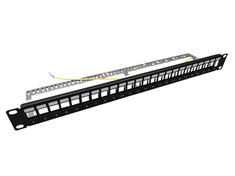 19" paneeli 24:llä keystone aukolla suojaamattomille Cat6 UTP taisuojatuille Cat6A / Cat7A STP liittimille. Pakkaus sisältää: Nippusiteetkaapeleiden kiinnittämiseen kaapeliohjurin taka-osaan jamaadoitusjohdon. Ei sisällä korimuttereita. Musta.