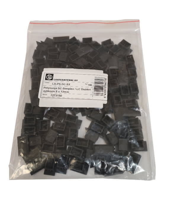 Pölysuoja peitetulppa kuitupaneelin tai kuitupäätekotelon käyttämättömien avonaisten SC-simplex tai LC-duplex aukkojen suojaksi, musta.