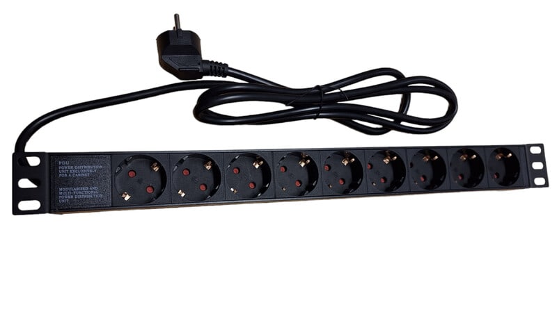 Pistorasiapaneeli 9:llä Suko-pistokkeella varustettuna (16A) ja 1.8 metrin virtajohdolla oleva 1U korkea musta pistorasiapaneeli 19" kaappiin tai telineeseen virranjakopaneeliksi.