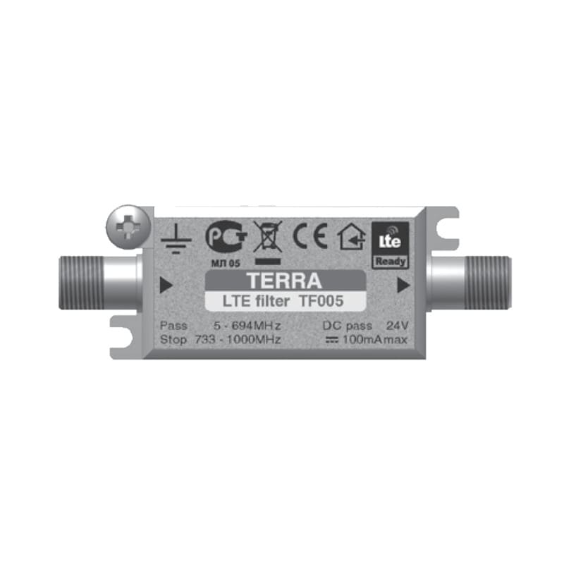 TF 005, LTE700-estosuodin. Putkimallinen FN/FN. Läpi 5-694 MHz, esto 733-1000 MHz. Estovaimennus 703 MHz > 13 dB, 733 MHz > 50 dB. DC-läpisyötöllä.