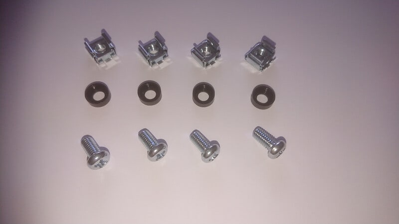 Korimutteri- ja ruuvisarja paketti paneeleiden ja muiden räkkituotteiden kiinnittämistä varten 19\" laitekaappeihin ja räkkeihin.