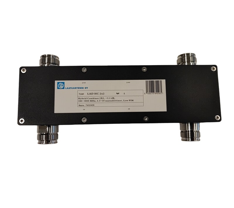 Low PIM hybrid Combiner 2x2, läpimenovaimennus 3.1 dB ja porttien välinen erotusvaimennus >25dB@380-2700MHz, >23dB@2701-3800MHz. Taajuusalueelle 380-3800 MHz, eli soveltuu VIRVE ja Mobiilitaajuuksille. Tehonkesto 200W/portti, Low PIM < -160dBc@2x43dBm, 4.3-10 naarasliittimet. Sisä- ja ulkokäyttöön (IP65). Kaikki käyttämättömät portit on päätettävä 50 ohmin keinokuormaan.