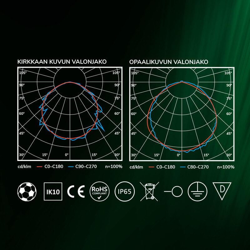 Valaisin täyttää pallotestin VDE 0710 Teil 13 -vaatimukset ja soveltuu urheilutilojen valaisuun.