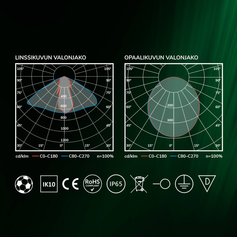 Valaisin täyttää pallotestin VDE 0710 Teil 13 -vaatimukset ja soveltuu urheilutilojen valaisuun.