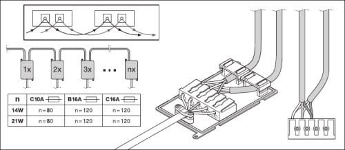 Enimmäismäärä valaisimia, johdonsuojakatkaisija C16: