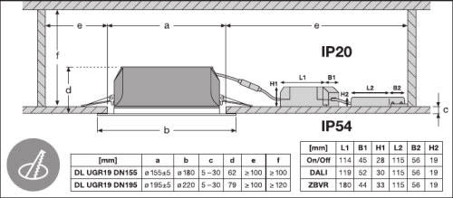 LEDVANCE DOWNLIGHT PERFORMANCE UGR19 alasvaloja on saatavana kahdella eri teholla (14 W ja 21 W), niistä löytyy mallit 3000 K ja 4000 K värilämpötilalla. 14 W:n alasvalo tuottaa 1600 lm (@4000 K), sen upotushalkaisija on 155 mm ja upotussyvyys vähintään 100 mm. 21 W:n alasvalo tuottaa 2520 lm (@4000 K), niiden upotushalkaisja on 195 mm ja upotussyvyys vähintään 120 mm. Uppoasennettuna levykattoon ovat valaisimet huoneen puolelta IP54-luokiteltuja. Alasvaloista löytyy myös erikseen mallit DALI-2 ”IoT Ready” virtalähteellä.