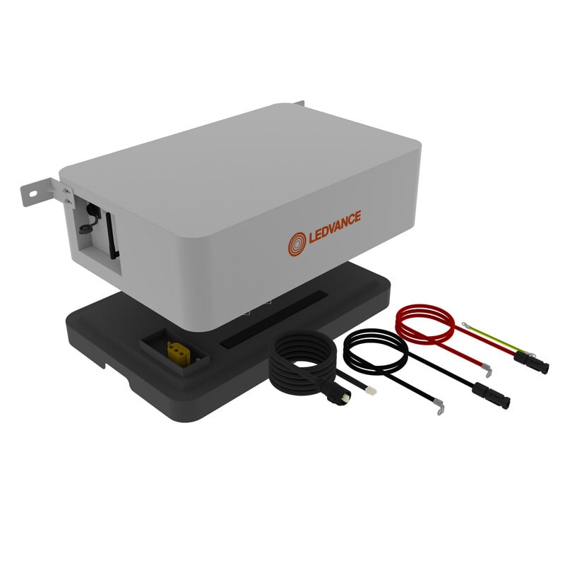 LEDVANCE LES-HV-SYS tarvikesarja LES-HV-4K akkumoduulille. Sisältää jalustan akkumoduulille, erillisen hallintayksikön (BMS) ja 2 metrin pituiset kytkentä- ja datakaapelit. Tarvikesarja sisältää: