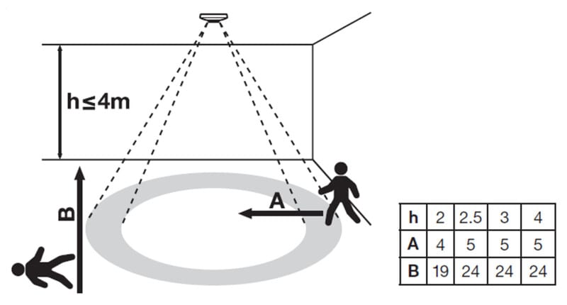 - Liikkeen havainnointialueen halkaisija: 24x5 m (2,5 m asennuskorkeus)