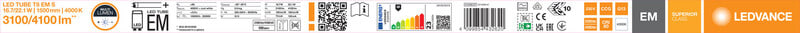 LEDVANCE LED TUBE T8 EM Superior 1500mm 4000K Multi Lumen G13 LED-valoputki 58W:n T8-loistelampun tilalle. Valovirta 4100 / 3100 lm ja valotehokkuus 185 lm/W. Pituus 1513 ja halkaisija 26,7mm. Keskimääräinen käyttöikä 100 000 h. Käyttö: kuristin tai 230V. LED TUBE T8 EM SUPERIOR -tuoteperheestä löydät erittäin pitkäikäiset 100 000 tunnin käyttöiällä varustetut VDE ENEC-sertifioidut LED-valoputket. Valoputken päästä löytyvästä Multi Lumen -liukukytkimestä voit valita pienemmän valovirran, jonka avulla voit säästää hieman enemmän energiaa. LED-valoputkien mukana toimitetaan oikosulkupala, jonka ansiosta LED-valoputken asentaminen loistelampun tilalle on helppoa.
