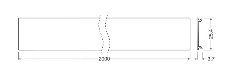 LEDVANCE PC/W04/C/2 leveän PW04-profiilin kirkas kupu, jonka pituus 2000 mm, leveys 25,4 mm ja korkeus 3,7 mm.