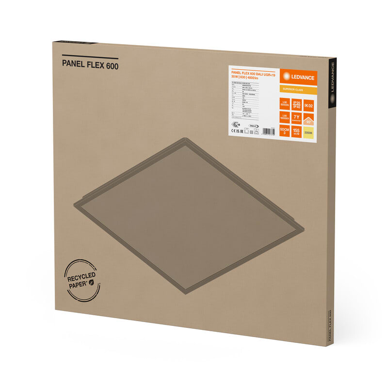 LEDVANCE PANEL FLEX 600 30W 3000K UGR<19 DALI LED-moduulivalaisin. Valovirta 4800 lm, avauskulma 90D, värintoistoindeksi yli 80 ja valotehokkuus 155 lm/W. IP40- ja IK02-luokiteltu. Mitat: 595 x 595 x 32 mm. Keskimääräinen käyttöikä 100 000 h. PANEL FLEX -tuoteperheestä löydät erittäin pitkäikäiset ja energiatehokkaat LED-moduulivalaisimet Multi Lumen-ominaisuudella. Panel Flex -valaisimien keskimääräinen käyttöikä on jopa 100 000 (L80/B10) ja valotehokkuus jopa 169 lm/W. Mukana uusi helpommin asennettava 5-napainen kytkentäkotelo.