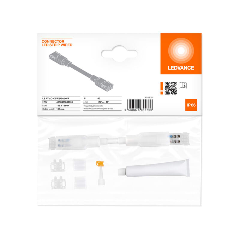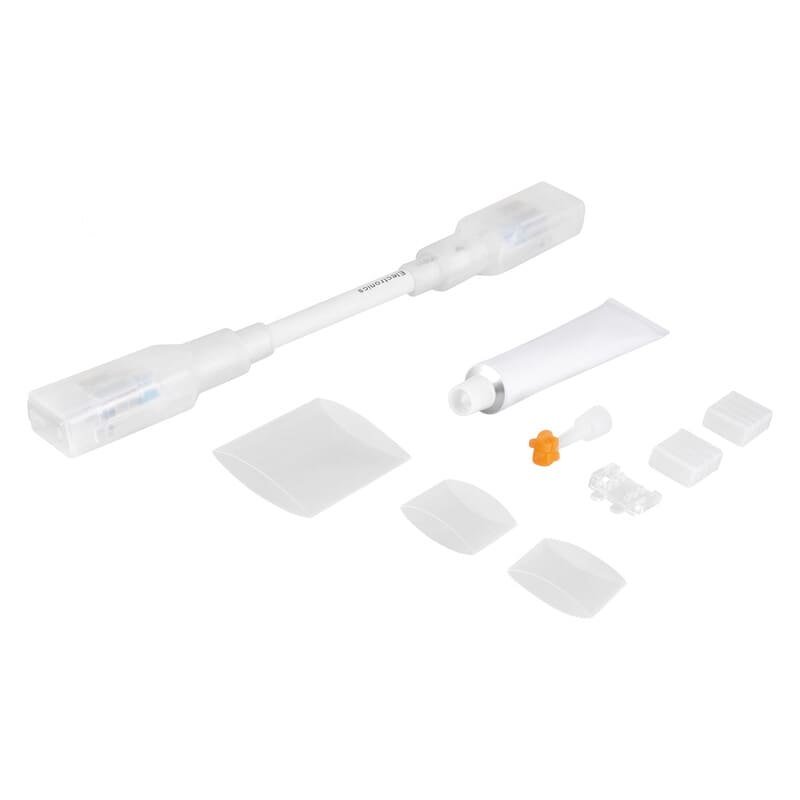 LEDVANCE STRIP ACCESSORY AC EXTENSION CONNECTOR liitin LEDVANCE LED Strip AC -valonauhan jatkamiseen. Yksi pussi sisältää liittimen, silikoniliiman, kaksi päätyholkkia ja neljä kutistesukka palaa.
