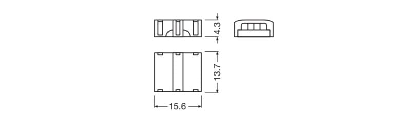 LEDVANCE LED STRIP Accessory Strip Direct Connector P5 5-napainen jatkoliitin RGBW LED-nauhalle. Mitat: 15,6 x 13,7 x 4,3 mm.