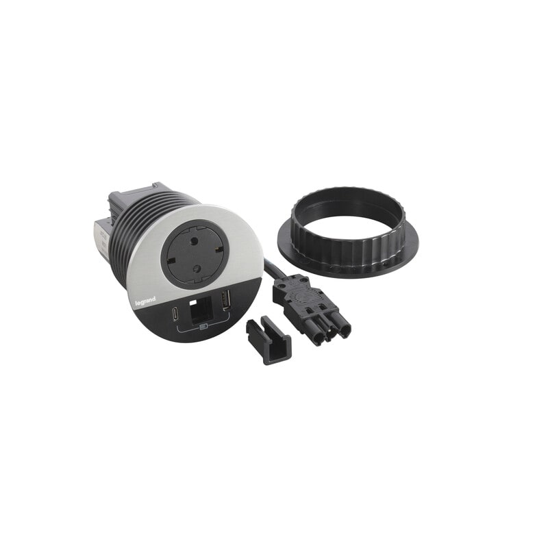 Incara Disq 80 yhdistää mobiilikäyttäjille olennaiset toiminnot yhteen paikkaan. USB A+C -pistoke 15 W latausteholla sekä RJ45 Cat 6 UTP-verkkoliitäntä tai kaapeliläpivientiaukko. Asennetaan huonekaluissa yleisimmin käytettävään Ø80 mm:n aukotukseen. Ainutlaatuinen patentoitu Legrand-sukopistorasiamekanismi säilyttää pinnan tasaisena kun se ei ole käytössä. Tasainen pinta helpottaa puhtaanapitoa ja näyttää hyvältä. Saatavilla suko- tai Wieland-pistoliitinjohdolla.