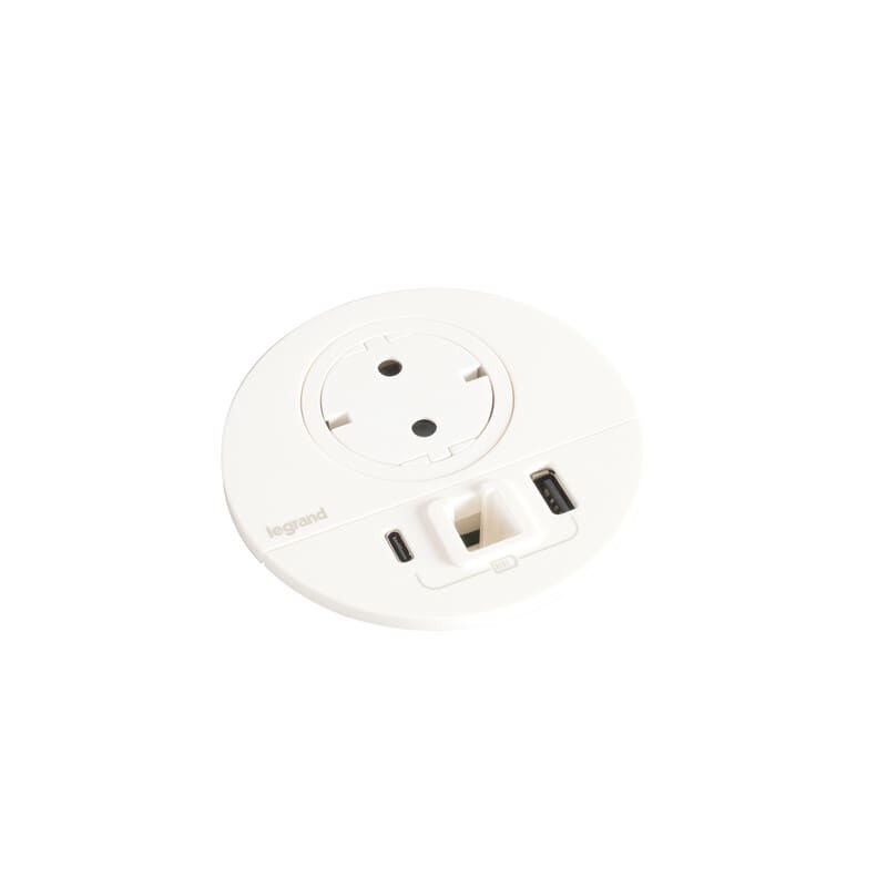Incara Disq 80 yhdistää mobiilikäyttäjille olennaiset toiminnot yhteen paikkaan. USB A+C -pistoke 15 W latausteholla sekä RJ45 Cat 6 UTP-verkkoliitäntä tai kaapeliläpivientiaukko. Asennetaan huonekaluissa yleisimmin käytettävään Ø80 mm:n aukotukseen. Ainutlaatuinen patentoitu Legrand-sukopistorasiamekanismi säilyttää pinnan tasaisena kun se ei ole käytössä. Tasainen pinta helpottaa puhtaanapitoa ja näyttää hyvältä. Saatavilla suko- tai Wieland-pistoliitinjohdolla.