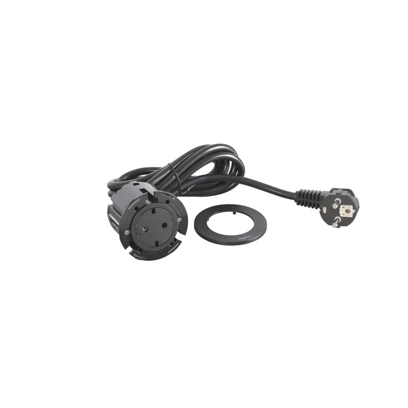 Disq 60 pistorasian sisältävä työpistetuote. Asennus Ø60 mmkalusteaukotukseen. 2m sukoliitosjohto.