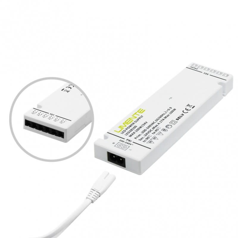 LIMENTE LED28100-virtalähde, 24 V, 0-100 W, (6xTOP)24 V Virtalähde Led-valaisimille. LIMENTE 24 V virtalähteet on suunniteltu toimimaan yhdessä 24 V LIMENTE-valaisimien kanssa. Rakenteeltaan virtalähteet ovat mahdollisimman matalia, jolloin ne on helppo piilottaa esimerkiksi kalusteisiin.Kaikissa virtalähteissä on valmiina ensiöpuolen johto verkkovirtaan kytkemistä varten, liittimet valaisimia varten sekä lisäksi monipuoliset suojaukset erilaisia vikatilanteita varten.Virtalähteitä on saatavissa sekä 12 V että 24 V malleina. Mikäli valitset 12 V valaisimen, tulee sinun käyttää myös 12 V virtalähdettä. 12 V virtalähteet ja valaisimet tunnistat valkoisesta TOP-liittimestä valaisimessa ja vastaavasti valkoisesta jakotukista virtalähteessä. 24 V tuotteissa liittimet ja jakotukit ovat mustia.Suojaukset- ylijännitesuoja, virtalähde palautuu takaisin toimintaan virhetilanteen poistuttua- oikosulkusuoja, virtalähde palautuu takaisin toimintaan virhetilanteen poistuttua- ylikuumenemissuoja, virtalähde palautuu takaisin toimintaan virhetilanteen poistuttua. Toimitussisältö: 100W virtalähde integroidulla jakotukilla, irrotettava 1,5m virransyöttöjohto (2 x 0,75mm²) pistotulpalla, Plastic Free-pakkaus