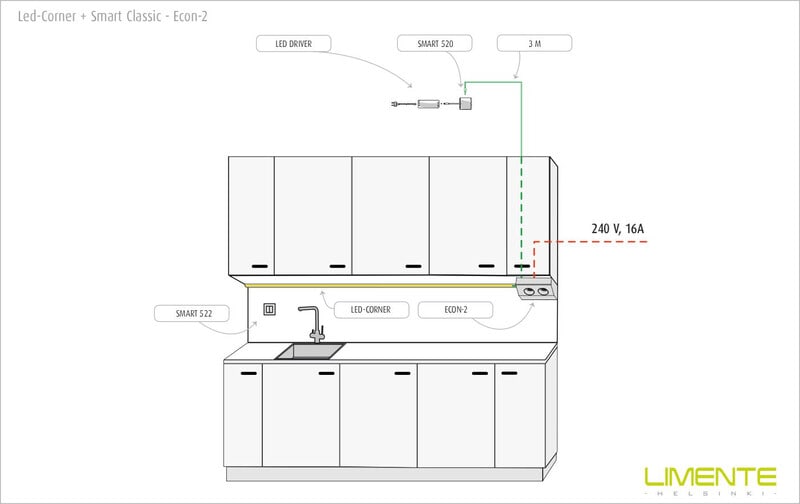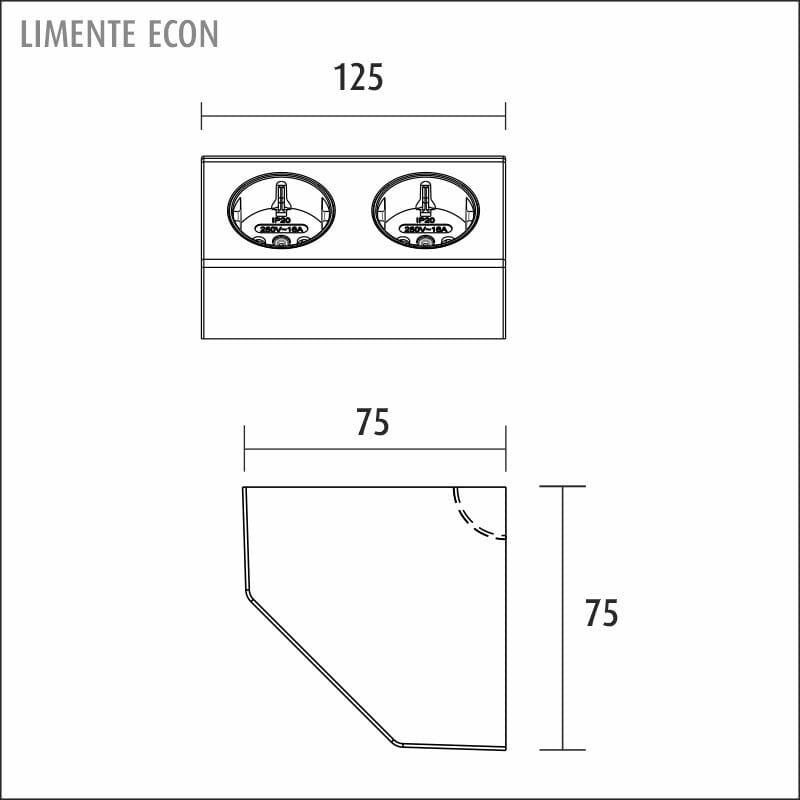 LIMENTE ECON –sarjan pistorasiat on Suomessa muotoiltu ja suunniteltu monipuolisiksi välitilan pistorasiavaihtoehdoiksi. Viisto muotoilu mahdollistaa pistorasian helpon käytön ja näet selkeästi, missä suunnassa pistotulppa asetetaan pistorasiaan. Kulmaan asennettava välitilapistorasia on varustettu lapsisuojalla. ECON-2 -pistorasiassa on paikka kahdelle pistotulpalle. Pistorasian voi asentaa oikea- tai vasenkätisenä, mikä helpottaa johtojen liittämistä mahdollistaen liitosjohdon tulemisen oikealta, vasemmalta yläpuolelta tai seinästä. Käyttäjän kannalta pistorasia on aina samannäköinen, riippumatta siitä kumman kätisenä se on asennettu. Määrittele paikka, johon sähkösyöttö tuodaan, tai käytä olemassa olevaa syöttökaapelia. LIMENTE ECON -pistorasia tarvitsee aina oman max. 16 A virransyötön. Kiinnitä seinästä, yläpuolelta tai sivuilta tuleva virransyöttökaapeli pistorasian liittimiin. Lopuksi kiinnitä pistorasia neljästä kulmasta mukana olevien ruuvien avulla kiinteää pintaa vasten. Toimitussisältö: kaksoispistorasiam kiinnitysruuvit, pikaliitin, plastic free-pakkaus.