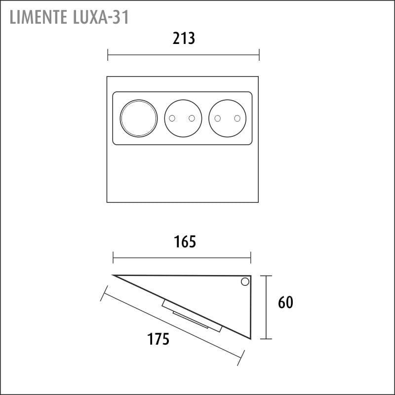 LIMENTE LUXA-31 on suunniteltu välitilan pistorasiaksi, jolla voidaan myös ohjata 24 V välitilavalaistusta. Se on nopea ja yksinkertainen asentaa ja sitä voidaan käyttää kaikenlaisten LIMENTE valaisimien kanssa. Viiston muotoilun ansiosta pistorasiat ovat aina helposti käytettävissä ja näet selkeästi, missä suunnassa pistotulppa asetetaan pistorasiaan. LUXA-pistorasiat ovat aina kaksiosaisia ja niissä on on/off-kytkin pistorasian 30 W integroituun virtalähteeseen liitettäville 24 V valaisimille. Kytkimen avulla voit ohjata esimerkiksi välitilavaloja. Yhdistämällä LIMENTE LUXA:n LIMENTE-profiilivalaisimiin, luot tyylikkään kokonaisuuden keittiön välitilaan. Kaikkien pistorasioiden materiaali on joko ruostumaton teräs tai maalattu valkoinen (metallirunko) ja ne on varustettu lapsisuojalla. Toimitussisältö: kaksoispistorasia, taustalevy, integroitu 30W virtalähde, ohjaus kytkimestä, 2 x virransyöttö valaisimille naaras TOP-liittimillä, jousiliitinkytkentä syötölle, plastic free-pakkaus.