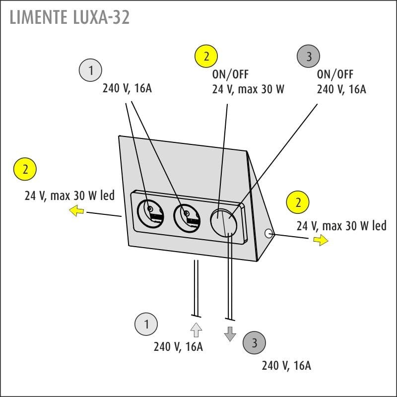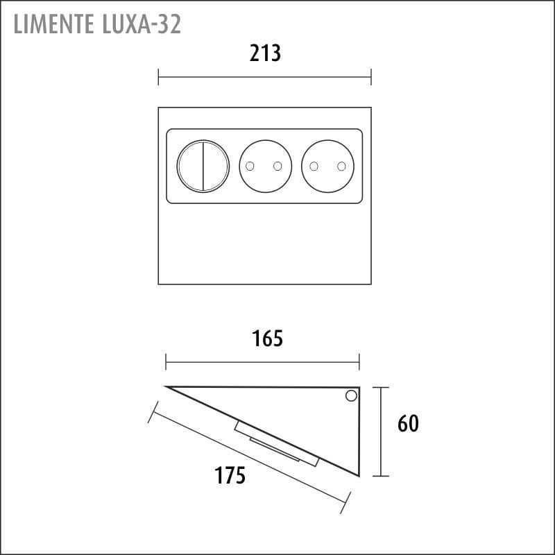 LIMENTE LUXA-32 on suunniteltu välitilan pistorasiaksi, jolla voidaan myös ohjata 24 V välitilavalaistusta sekä lisäksi 240 V sähkölaitteita. Se on nopea ja yksinkertainen asentaa ja sitä voidaan käyttää kaikenlaisten LIMENTE valaisimien kanssa. Viiston muotoilun ansiosta pistorasiat ovat aina helposti käytettävissä ja näet selkeästi, missä suunnassa pistotulppa asetetaan pistorasiaan. LUXA-pistorasiat ovat aina kaksiosaisia ja niissä on on/off-kytkin pistorasian 30 W integroituun virtalähteeseen liitettäville 24 V valaisimille. Luxa-32 pistorasiassa kytkin on kaksiosainen ja toisella painikkeella ohjataan erilliseen jousiliittimeen kytkettävää 240 V ulostuloa. Kytkimen avulla voit samanaikaiseti ohjata esimerkiksi välitilavaloja ja kodinkonetta. Yhdistämällä LIMENTE LUXA:n LIMENTE-profiilivalaisimiin, luot tyylikkään kokonaisuuden keittiön välitilaan. Kaikkien pistorasioiden materiaali on joko ruostumaton teräs tai maalattu valkoinen (metallirunko) ja ne on varustettu lapsisuojalla. Toimitussisältö: kaksoispistorasia, suojalevy, 240V ulostulo jousiliitinkytkennällä, ohjataan kytkimestä, integroitu 30W virtalähde, ohjataan kytkimestä, 2 x 24V virransyöttö valaisimille naaras TOP-liittimillä, jousiliitinkytkentä syötölle, plastic free-pakkaus.