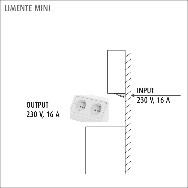 Pelkistetyn muotoilunsa ansiosta Mini-pistorasioita voidaan käyttää kaikkien Limente-valaisimien kanssa. Mini-pistorasioita on yksi- kaksi- ja kolmeosaisia. Lisäksi Mini-2 on saatavissa kytkimellisenä mallina (Limente Luna). Pistorasioiden materiaali on joko ruostumaton teräs, maalattu valkoinen tai mattamusta. Pistorasia tarvitsee aina oman virransyötön ja ne on varustettu lapsisuojalla. Toimitussisältö: pistorasia, taustalevy, kiinnitysruuvit, pikaliitin.