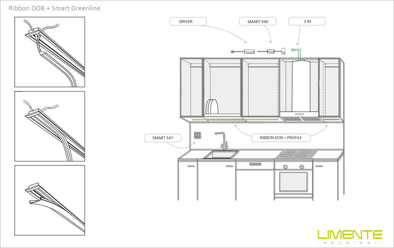 Asennus LIMENTE RIBBON IP44 DOB-nauhan asennus on nopea ja helppo suorittaa. Virransyöttöjohto, joka usein piilotetaan esim. kaapin taakse, laitetaan valmiiksi paikoilleen siten, että urospää tulee lähelle virtalähdettä ja naaras lähelle RIBBON DOB -valonauhaa. Valonauhasta poistetaan teipin suojakalvo ja nauha painetaan asennuspaikkaan. Lopuksi virransyöttöjohto kytketään kiinni valonauhaan sekä virtalähteeseen pikaliittimillä. RIBBON DOB on lyhennettävissä 3 cm välein ja sen molemmissa päissä on virransyöttö, eli voit hyödyntää molemmat päät tarvittaessa erikseenkin. RIBBON DOB on aina kiinnitettävä lämpöä johtavaan materiaaliin, kuten esimerkiksi lisätarvikkeena saatavaan alumiiniprofiiliin. Tällä tavoin varmistetaan led-nauhalle luvatun eliniän toteutuminen. Kaikissa tapauksissa varmista, että kiinnityspinta on ehdottoman puhdas ja kuiva ennen kuin kiinnität led-nauhan. Toimitussisältö: - led-nauha,jonka molemmissa päissä virransyöttöliitin - 2 x 3m virransyöttöjohto TOP-liittimin