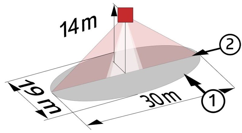- Valvonta-alue 14m asennuskorkeudessa: ovaali 30 m ja 19 m sivusuunnassa sekä kohti tunnistinta