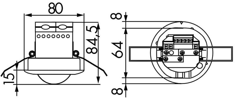 - Valvonta-alue 2,5m asennuskorkeudessa: Ø 10 m sivusuunnassa / Ø 6 m kohti tunnistinta / Ø 4 m istuttaessa
