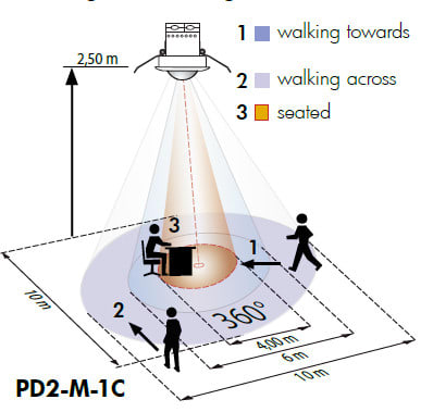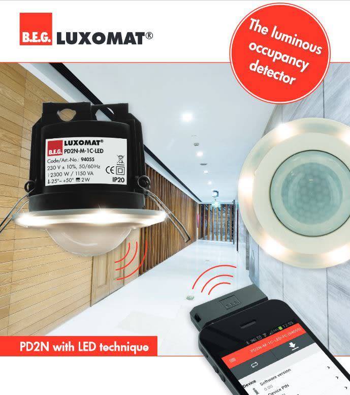 Kattoonasennettava läsnäolotunnistin jossa on myös sisäänrakennettu LED opastusvalo, joka sijaitsee tunnistimen ulkorenkaassa. Tunnistimessa oleva LED opastusvalo voi toimia joko opastus- tai yövalona. Tunnistin soveltuu erityisesti käytettäväksi ohjaamaan valaistusta käytävissä ja eteistiloissa. Näissä tiloissa pyritään viihtyvyyden ja turvallisuudentunteen vuoksi pitämään jonkinlainen perusvalaistustaso. Tyypillisesti tämänkaltaisia ympäristöjä ovat esimerkiksi hotellien käytävät, joissa usein valaistus on päällä koko ajan. Luxomatin viimeisin tuoteuutuus on ideaalinen ja kustannustehokas ratkaisu esimerkiksi hotellikäytävien valaistukseen ja ohjaukseen. Valaisimet voivat olla päälle/pois kytkettäviä kun viiveaikojen umpeuduttua tunnistin tuottaa perusvalaistustason alueille. Esimerkki: Käytävässä kytkettäviä valaisimia, jotka on ohjattu PD2N-M-1C-LED tunnistimella. Valaisimien poiskytkentäviive on esimerkiksi 10 min. Tunnistimeen integroitu opastusvalo on toiminnassa täydellä teholla ensimmäiset 2 tuntia päävalojen poiskytkennän jälkeen. Jos tilassa ei havaita ketään tämänkään ajan jälkeen voidaan opastusvaloa himmentää esimerkiksi 50% teholle kunnes tunnistin sytyttää valaisimet uudelleen.