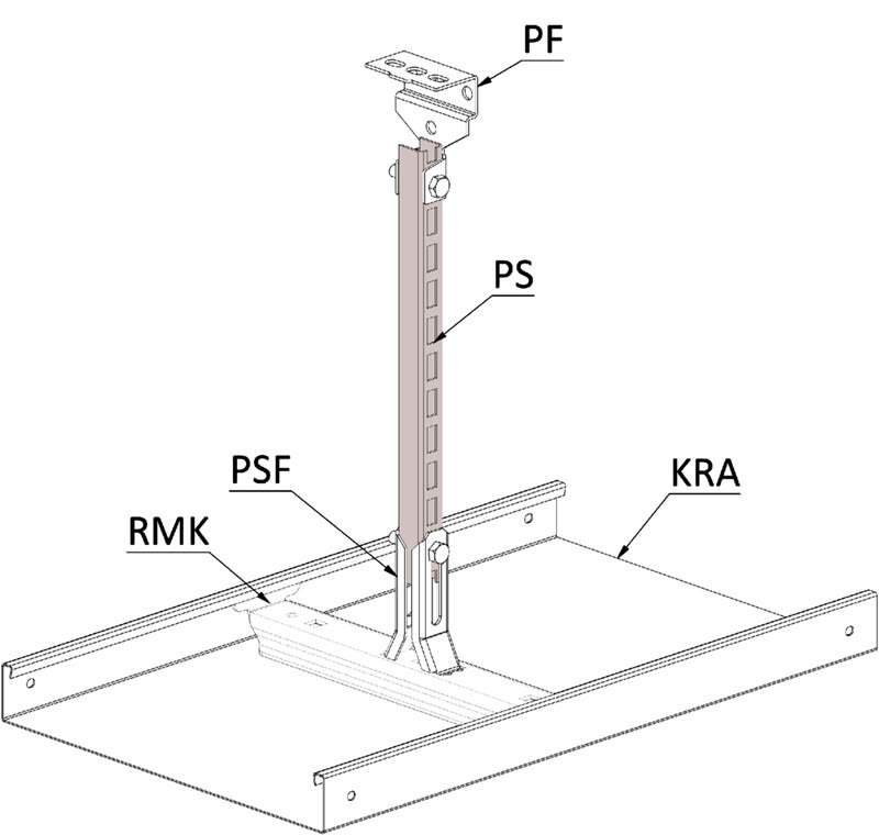Asennuskiskolla PS tehdään tikashyllyjen KS20 ja KS60 sekä levyhyllyjen KRA ja KRB kattokannatukset käyttäen kiinnikettä PSF ja kattokiinnikettä PF.