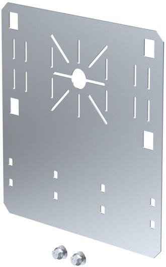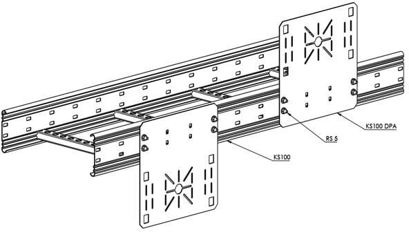 Rei’itetyllä asennuslevyllä KS100 DPA kiinnitetään jakorasioita ja asennuskalusteita KS100 tikashyllyn sivuputkiin.