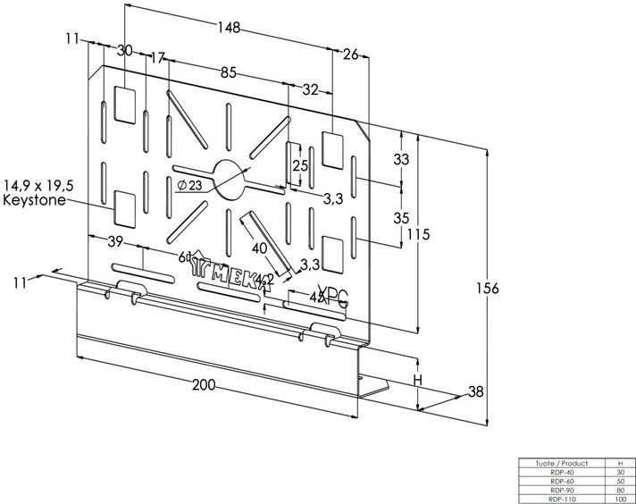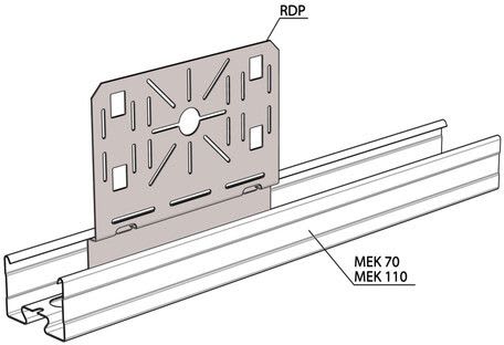 Asennuslevy levyhyllyyn ja valaisinkiskoon, terästä, sinkitty, korroosioluokka C1-C2 Asennuslevyllä RDP asennetaan jakorasiat ja asennuskalusteet levyhyllyihin KRA ja KRB sekä valaisinkiskoihin MEK 70 S, MEK 70 K, MEK 70, MEK 110, KRV ja AluMEK.