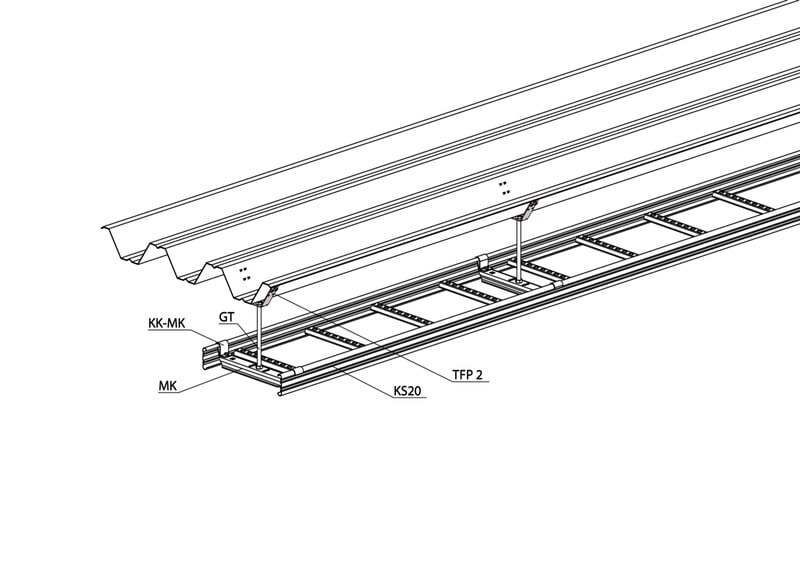 Kattokiinnikkeellä TFP2 kiinnitetään kattoprofiileihin ja poimulevyihin GT kierretankoja.