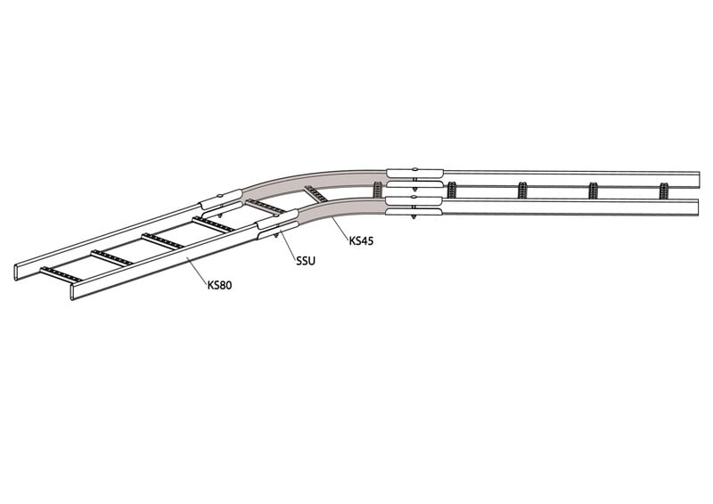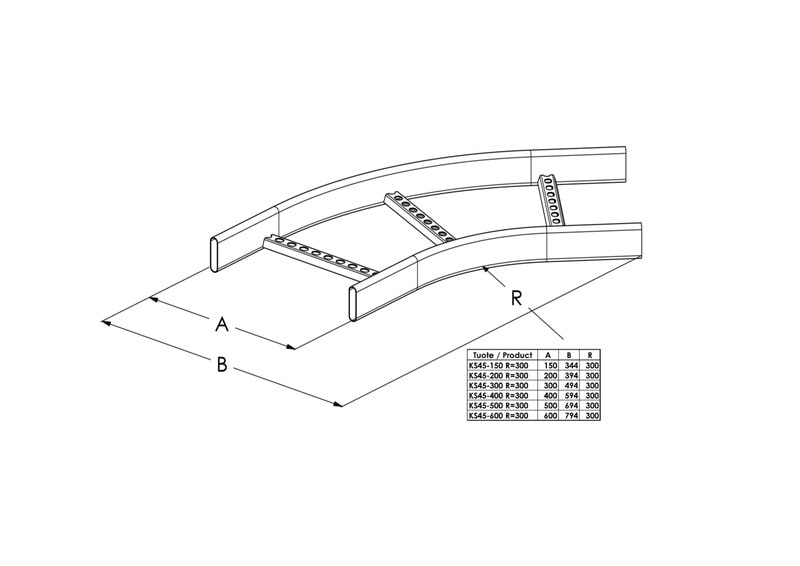 Kulmakappaleella KS45 tehdään 45° kulma tikashyllyille KS20, KS60, KS80 ja KS80 SP2.0. Kulmakappaleen säde on R=300 mm.