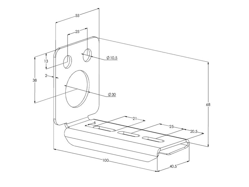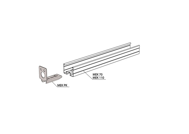 Päätykiinnike valaisinkiskoon, terästä, kuumasinkitty, korroosioluokka C1-C4 Päätykiinnikkeellä MEK PK kiinnitetään valaisinkisko AluMEK, MEK 70 S, MEK 70 K, MEK 70 ja MEK 110 seinään.