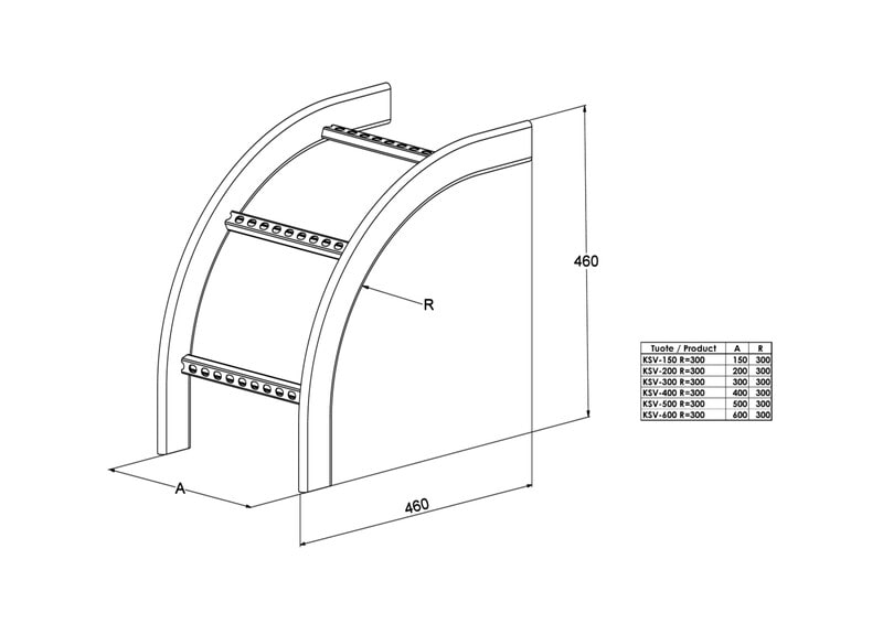 Pystykulmalla KSV tehdään laskeva 90° kulma tikashyllyille KS20, KS60, KS80 ja KS80 SP2.0. Kulmakappaleen säde on R=300 mm.