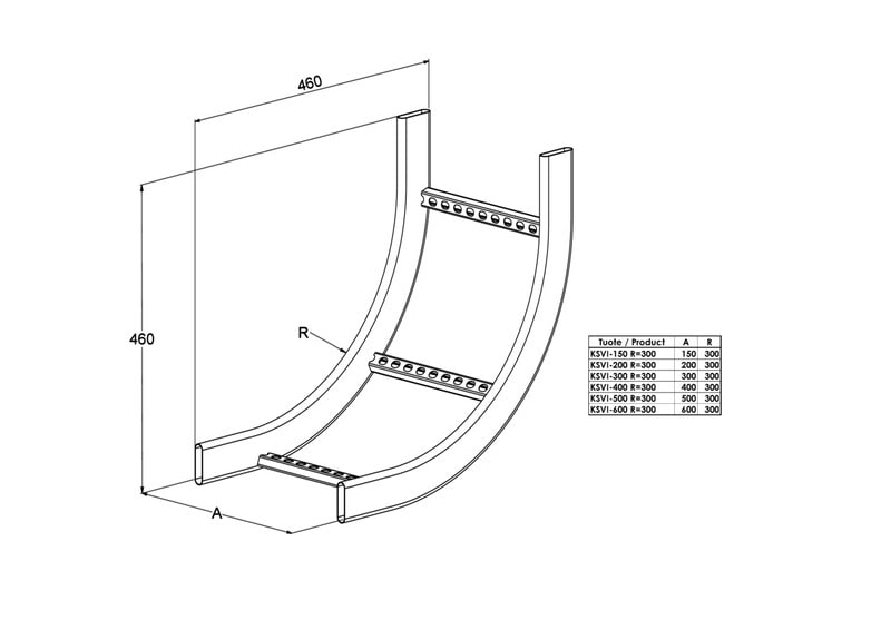 Pystykulmalla KSVI tehdään nouseva 90° kulma tikashyllyille KS20, KS60, KS80 ja KS80 SP2.0. Kulmakappaleen säde on R=300 mm.