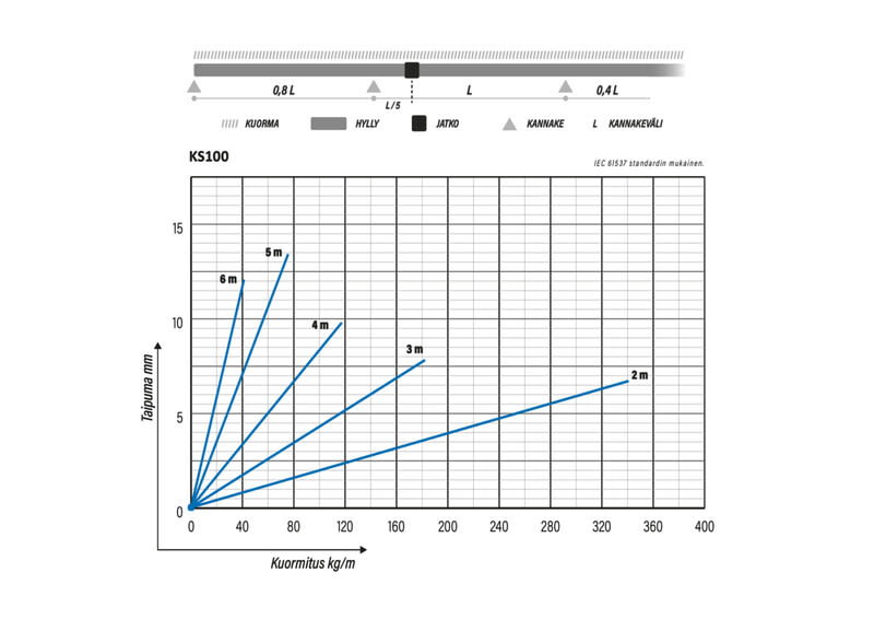 IEC 61537:n mukainen turvallinen työkuorma, kun tukiväli on 5,0 m.: