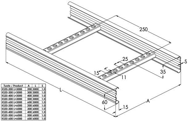 Tikashylly, leveys 500 mm, korkeus 60 mm, pituus 3000 mm, terästä, sinkitty, korroosioluokka C1-C2