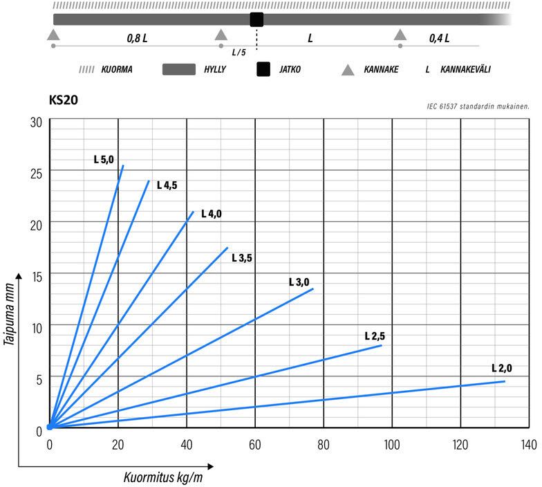 IEC 61537:n mukainen turvallinen työkuorma, kun tukiväli on 5,0 m.: