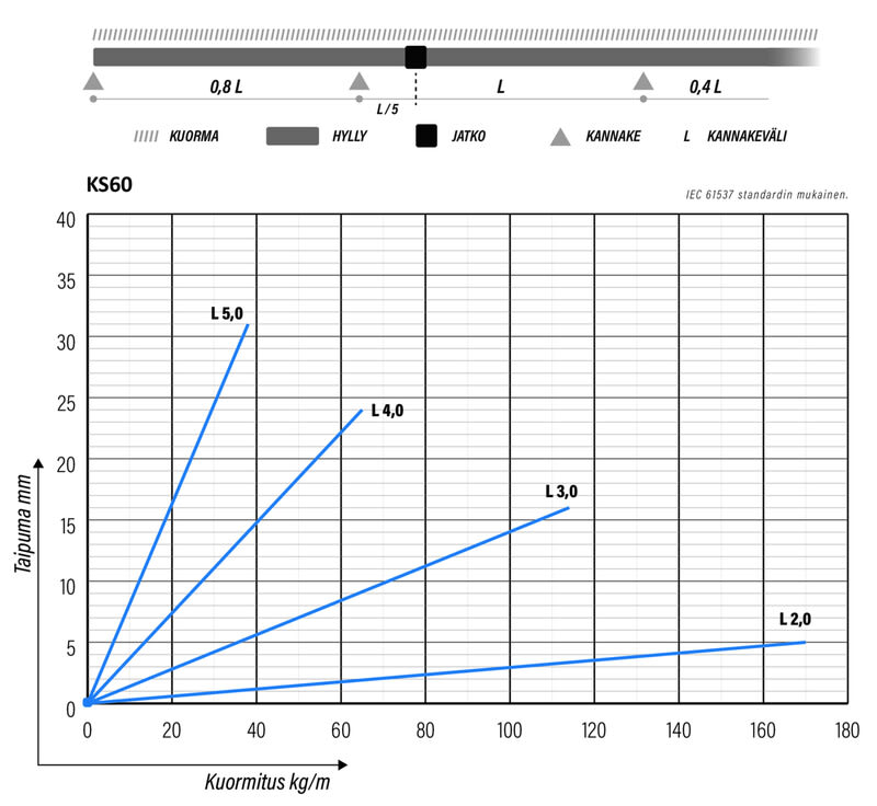 IEC 61537:n mukainen turvallinen työkuorma, kun tukiväli on 5,0 m.: