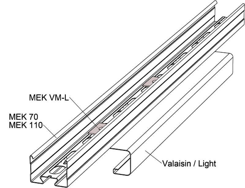 Valaisinkiinnike Valaisinkiinnikkeellä MEK VM-L asennetaan valaisimet ja muut laitteet valaisinkiskoihin AluMEK, MEK 70 S, MEK 70 K, MEK 70 ja MEK 110.