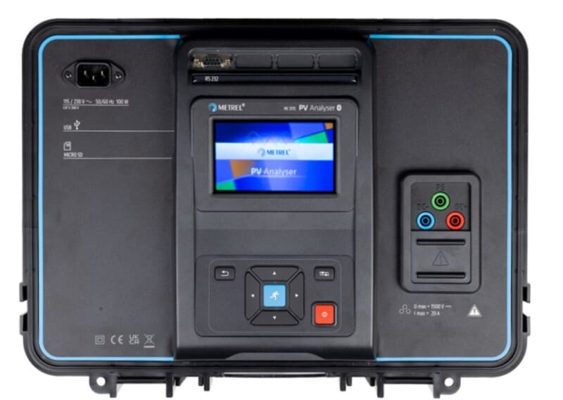 Metrelin uusi MI-3115 PV analyzer on tarkoitettu aurinkovoimaloiden käyttöönottomittauksiin sekä aurinkovoimaloiden hyötysuhteen mittauksiin. MI-3115 voidaan kytkeä aina 1500V DC jännitteellisiin paneeliryhmiin helposti mukana tulevien MC4 liittimien avulla. Mittalaitteella suoritat helposti vaadittavat mittaukset DC aurinkovoimalan käyttöönottomittauksissa. Lisäksi mittaamalla ympäristönparametrit, saadaan mittaustulokset laskettua automaattisesti STC (Standard Test Conditions) arvoihin. Ympäristöparametrien mittauksiin mukana tulee langattomasti toimiva etätallennin, joka voidaan sijoittaa lähelle mitattavia aurinkopaneeleita. Mittalaitteen käyttö on helppoa suuren värillisen kosketusnäytön ansiosta. Näin myös mittaustulosten dokumentointia ja nimeäminen on helppoa itse laitteella. Mittalaite kertoo käyttäjälle kytkentäkaaviot jokaiselle mittaukselle erikseen, jolloin käyttäjän on helppo suorittaa tarvittavat kytkennät.