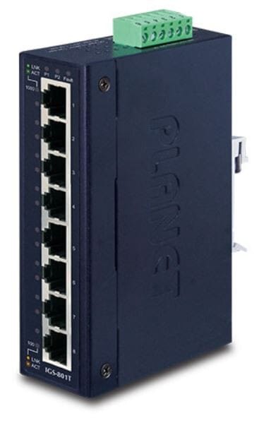 PLANET IGS-801T on 8-porttinen Industrial-tason Gigabitin Ethernet-kytkin laajennetulla käyttölämpötila-alueella.