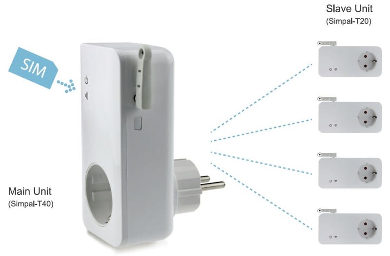SimPal T20-V2 on langattomasti etäohjattava etäpistorasia, jota voidaan ohjata SimPal T40-V2 GSM-pistorasian. SimPal T40-V2 tukee max. neljää (4x) siihen liitettyä SimPal T20-V2 orjapistorasiaa ja ne voivat olla max 30m etäidyydellä keskusyksiköstä. Pistorasia on suunniteltu sähkölaitteiden käynnistämiseen ja poiskytkemiseen tukien 16A virransyöttöä.