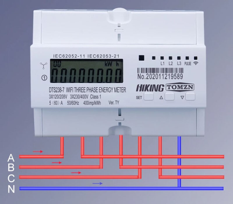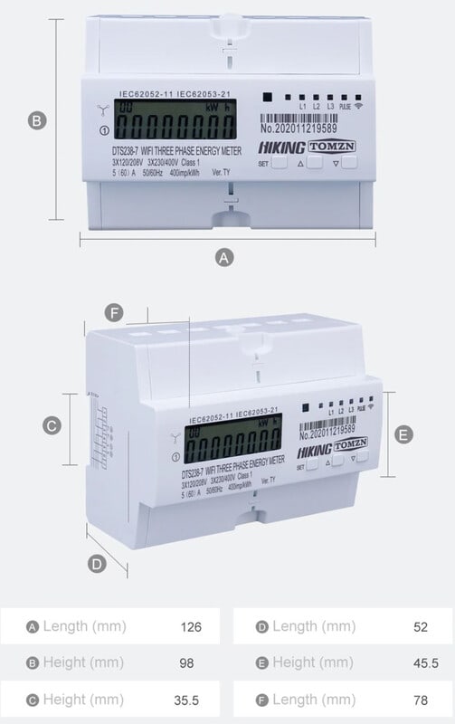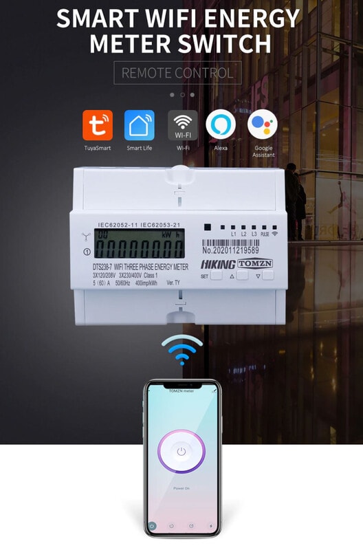TOMZN DTS238-7 on ryhmäkeskukseen asennettava 3-vaiheinen WiFi-ohjattava energiamittari. Energiamittauksen lisäksi laitteessa on ajastustoiminnot sekä virtojen päälle/poiskytkentä. Laite on varustettu informatiivisella LCD näytöllä, merkkivaloilla sekä ohjaus- ja ohjelmointipainikkeilla.