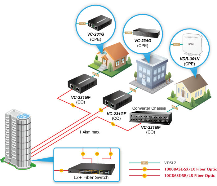 PLANET VC-231GF on VDSL2-Ethernet-muunnin SFP-modulipaikalla, joka mahdollistaa G.vectoring teknologian avulla 200/100Mbit/s tiedonsiirtonopeudet puhelinkaapelissa. SFP-modulipaikkaan voidaan asentaa haluttu Gigabitin SFP-valokuitumoduli. VDSL2-tekniikan käyttökohteita ovat mm. kiinteistöjen laajakaistaverkot, kiinteistöautomaatio, rakennusten ja toimipisteiden väliset tiedonsiirtoyhteydet, sekä lyhyen matkan internet-yhteydet operaattoriverkoissa.